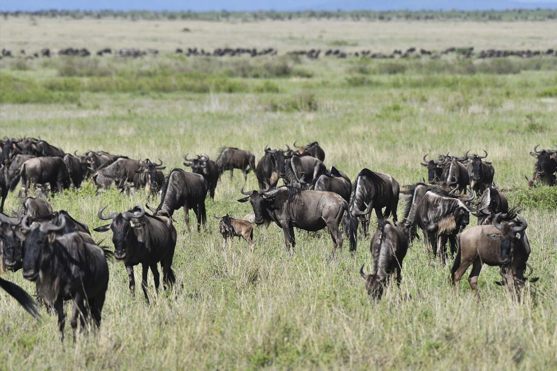 We are now in the calving portion of the wildebeest migration cycle. Hundreds of thousands of calves have been born, adding to the large herds of migrating animals moving through Ndutu, where our Migration Camp is currently located. Not only is the abundance of wildlife exciting for visitors, but also for the resident ‘big cats’ who inhabit the area, such as lions, leopards, and cheetahs. If you’ve visited recently you may have even spotted the lioness whose favourite tree to rest in happens to be right in front of our camp.